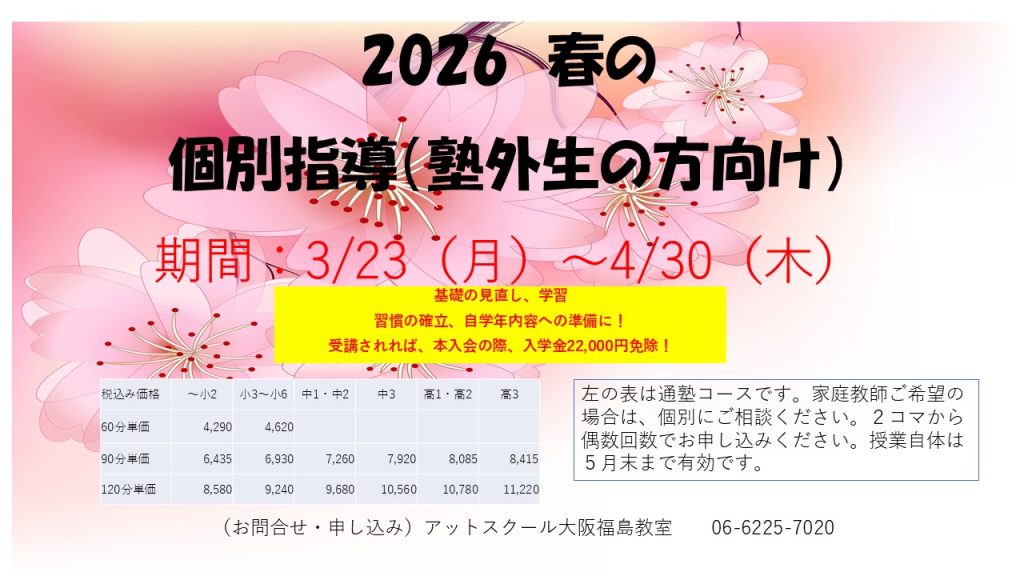 塾外の方にも、アットスクール大阪福島教室の個別指導を体験していただきたく思い、企画させていただきました。また、春の個別指導を履修後、本入会された場合は、入会金22,000が免除となります。