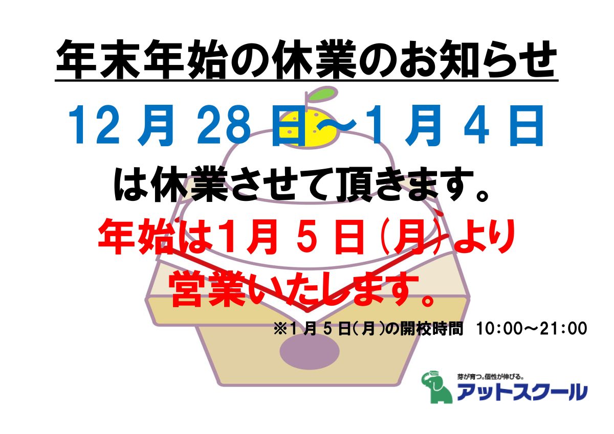 年始は、1月5日(月)からとなり、開校時間は10:00~21:00となります。