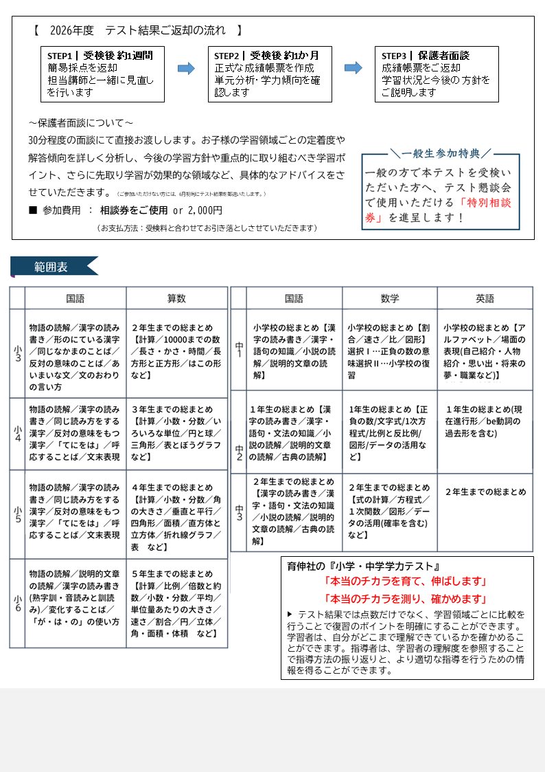 〇受検科目:小学生(国・算) 中学生(国・数・英)※英語のリスニング問題あり