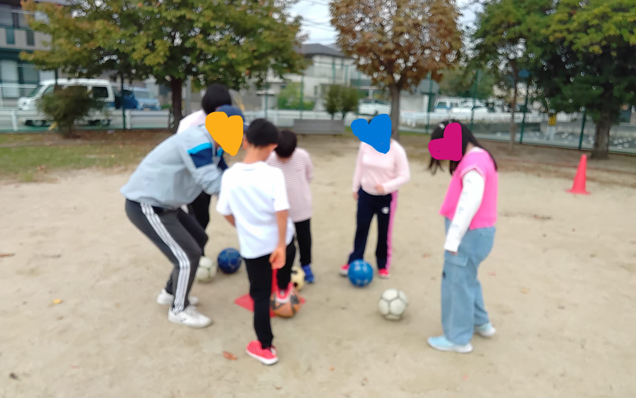 サッカーの後、少しの遊びの時間に「なにする?」を5人が話し合いました。YちゃんとIくんがみんなの意見をうまく調整し、数種類の遊びにチャレンジできました。時間内にみんな楽しく過ごすことができました。学びの教室での話し合い方法が外での実践にいかされたことはとっても嬉しかったです!