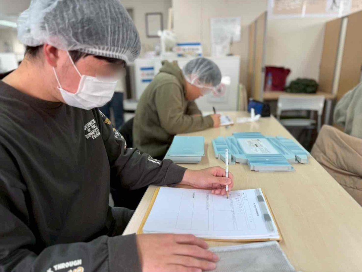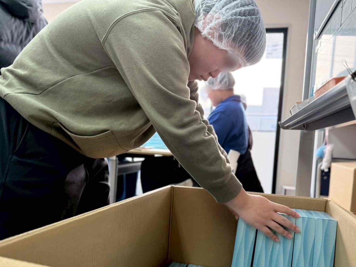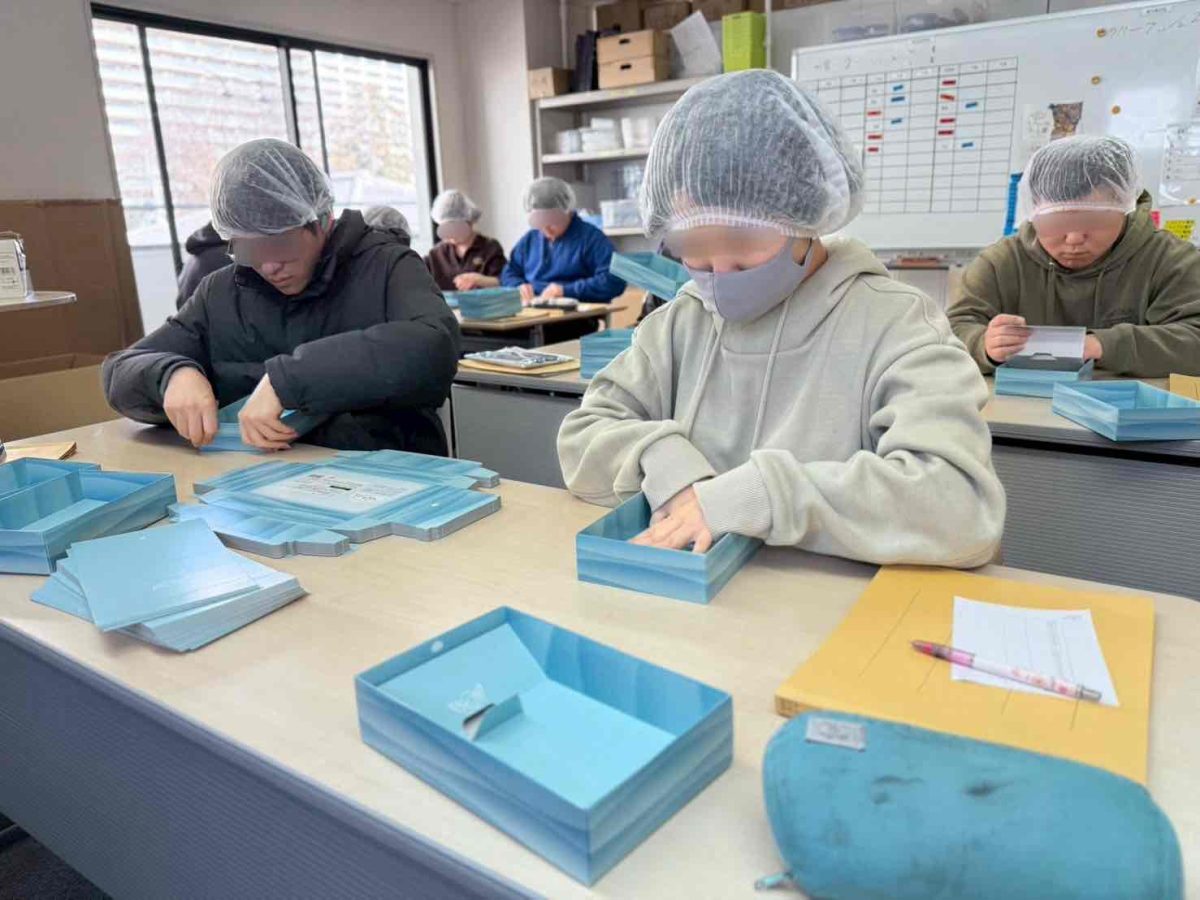 この一年で作業の段取り、コツ、スピード、正確さも格段にアップした生徒たち。初回のころはただ「体験」と構えてしまい雑談もありながらの生徒、失敗して大声を出してしまう生徒、上手くいかなさにイライラして体が動いてしまう生徒もいました。しかし最終回の今回は、ひたすら作業に集中し、商品を作成する音と「山川さん、検品お願いします」という声のみが聞こえるという状況。生徒それぞれが「仕事としての作業」を理解し進めていくことができていました。