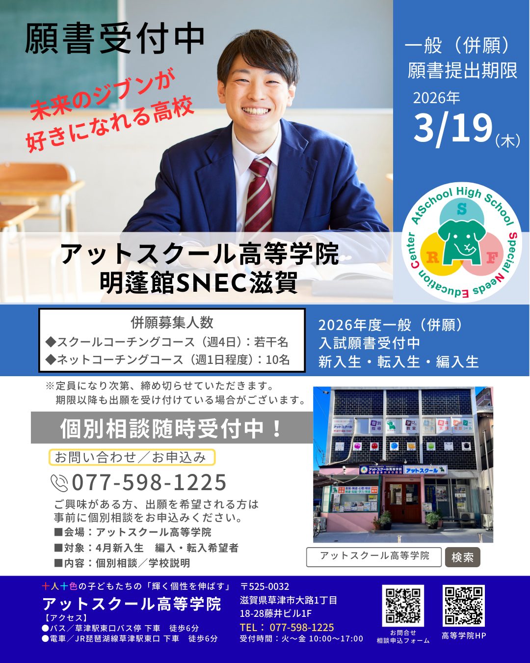【入試情報】アットスクール高等学院/明蓬館SNEC滋賀 R8年度一般(併願)入試 願書受付中