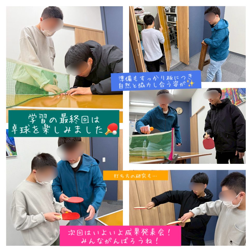 レクリエーションの卓球も準備からすっかり板について来て、自然と協力し合う関係に。打ち方について研究しあったり、和気藹々としています。